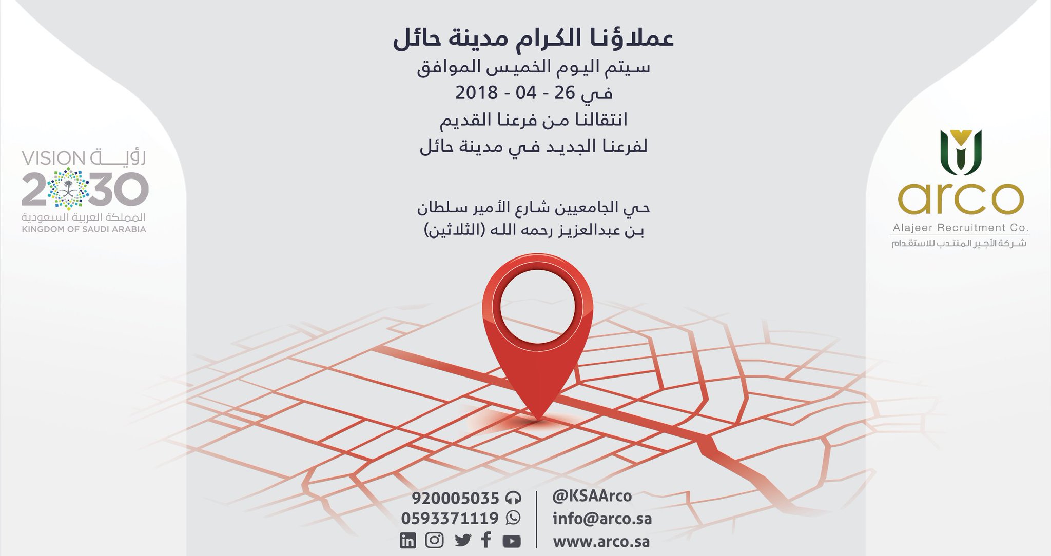 Arco شركة آركو للاستقدام On Twitter عملاؤنا الكرام مدينة حائل سيتم اليوم الخميس الموافق 26 04 2018 انتقالنا من فرعنا القديم لفرعنا الجديد بمدينة حائل حي الجامعيين شارع الأمير سلطان