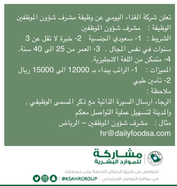 مشاركةللمواردالبشرية V Tvittere تعلن شركة الغذاء اليومي عن وظيفة مشرف شؤون الموظفين الوظيفة مشرف شؤون الموظفين الرياض مشاركة للموارد البشرية Hr Dailyfoodsa Com Https T Co Lbor7kj7xh